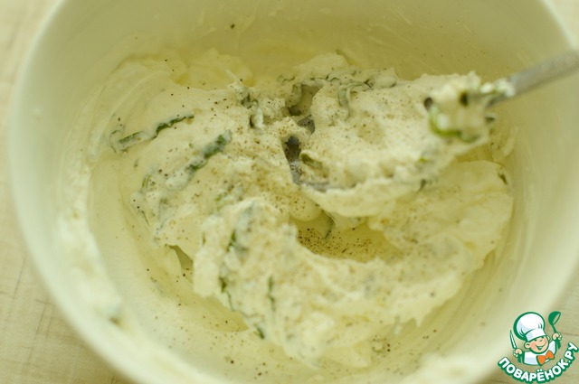 Базилик, 5 листочков, мелко нарезать, добавить к сыру, посолить, поперчить и перемешать.