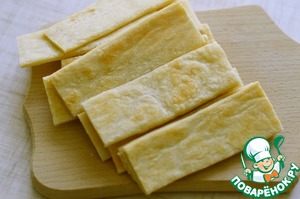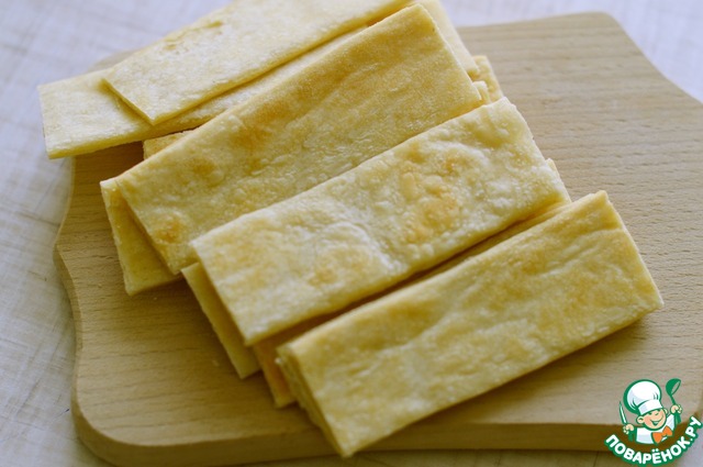 • 1. Тесто раскатать в пласт толщиной примерно 3 мм. Нарезать на полосы шириной примерно 2-3 см. Выложить полоски на противень. Сверху накрыть пергаментом, сверху поставить еще один противень.
