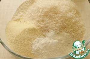 1. В чашке смешать просеянную муку, кокосовую стружку, манку, сахар, и разрыхлитель.