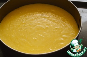 3. В масляную смесь постепенно ввести мучную. перемешивая лопаткой. Вылить тесто в разъемную форму 26 см. Духовку разогреть до 180С.
