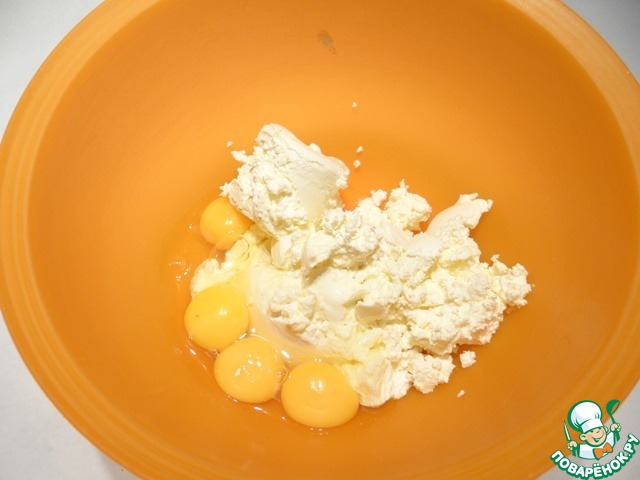 Готовлю сырный слой. В миске соединяю сливочный творожный сыр, яйца, рикотту.