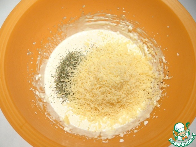 Добавляю сушеный тимьян, перец черный молотый и соль (как на мой вкус, так соли нужно добавлять в сырный слой совсем чуть-чуть, так как сыр уже содержит соль).