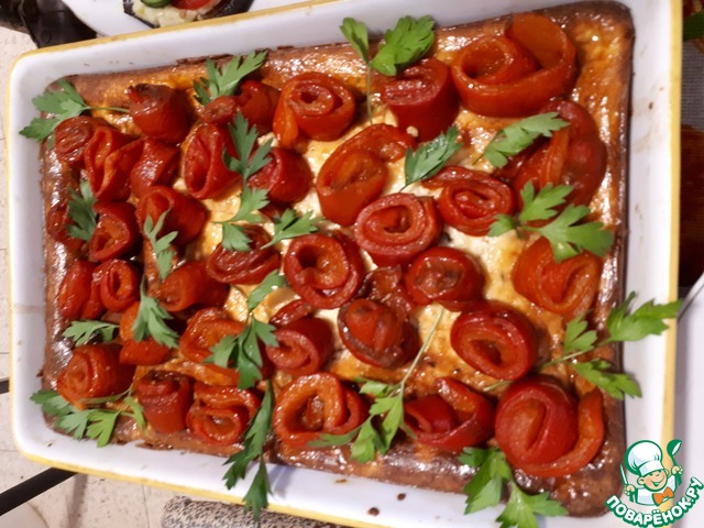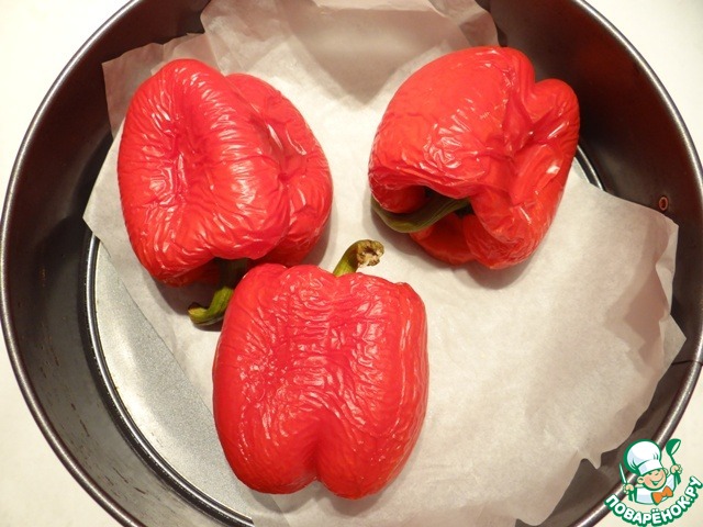 Запекаю перец в духовке при 180 градусов до мягкости. Время от времени перец переворачиваю. Даю перцу остыть в духовке, снимаю с него тонкую пленку, убираю плодоножки и семена. Непосредственно перед подачей украшаю чизкейк "розочками" из перца. Нарезаю перец на полоски шириной около 1-1,3 см, сворачиваю их.