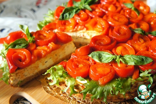 Выкладываю "розочки" из перца на остывший чизкейк, посыпаю сладкий перец солью по вкусу. В чашке соединяю оливковое масло и бальзамический уксус, с помощью кулинарной кисти смазываю сладкий перец. Украшаю чизкейк листьями базилика. Приятного Вам аппетита!