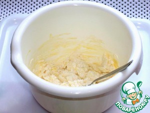 Творог растереть вилкой с яйцом и сметаной до однородности.