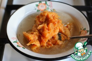 Теперь снимите с огня и введите фруктовый жмых, перемешайте до однородной консистенции и верните на огонь. Постоянно помешивая, варите 5 минут.