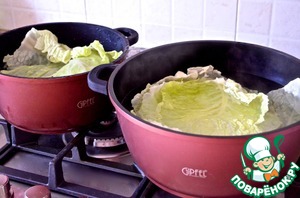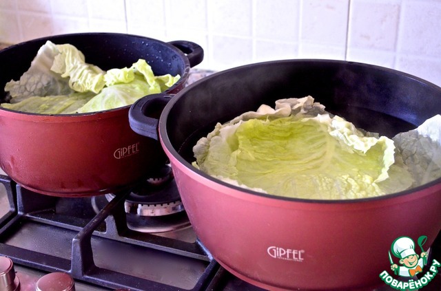 • 5. Бланшировать капустные листы в кипящей воде 2 минуты, затем остудить в холодной воде.