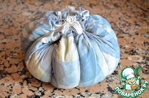 • 10. Связать полотенце крест на крест и перевязать кухонной нитью так, чтобы получилось 8 долек. Кастрюля, в которой будет вариться капуста должна быть по ширине чуть больше самой капусты, чтобы поддерживать ее форму.