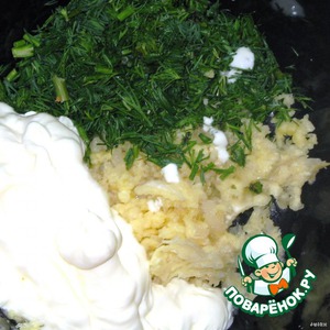 Выдавить через чеснокодавилку чеснок и заправить майонезом. Чуть-чуть посолить. Перемешать