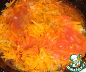 Морковь следует натереть на крупной терке и мелко порезать репчатый лук. Нагреваем сковороду, выливаем на нее растительное масло. Кладем лук и обжариваем 1-2 минуты, затем добавляем морковь и тушим 3 минуты. Добавляем томатный сок, хорошо перемешиваем, накрываем крышкой и тушим на медленном огне.