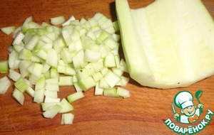 Кабачок помыть и очистить (также вырезать и мякоть). Кабачок порезать на маленькие кубики.