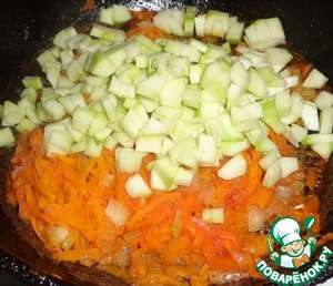 Добавляем кабачок к морковке и луку, посолить по вкусу. Перемешиваем и тушим, если начнет прилипать к сковороде, то добавить немного воды и тушить до готовности кабачка.