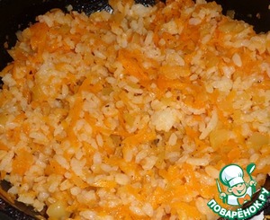 Когда кабачок будет готов, размять его немного ложкой. Затем добавляем отварной рис и протушить 1 минуту.