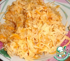 Выкладываем полученную массу в блюдо и добавляем тертый на крупной терке сыр.