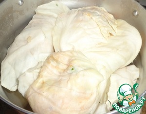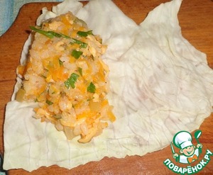 По желанию можете отварить капустные листья, я этого не делала, так как затем будем пропаривать готовые голубцы. Теперь заворачиваем начинку в капустные листья.
