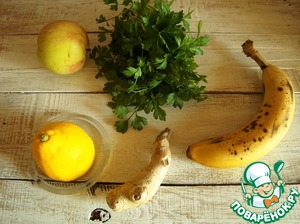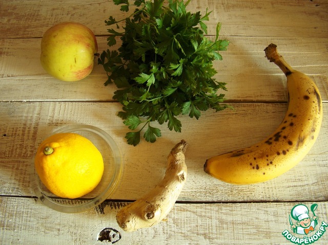 Банан нарежем небольшими кусочками, выдавим сок лимона. Отправим в чашу блендера. Корень имбиря очистим и натрем на терке или мелко порежем. Яблоко освободим от кожуры и удалим сердцевину. Режем небольшими кусочками. Петрушку перебираем и листики отправляем в чашу блендера.