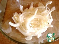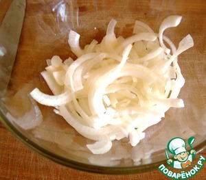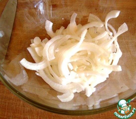 Белый салатный лук режем полукольцами. Отправляем в салатник и заправляем оливковым маслом. |