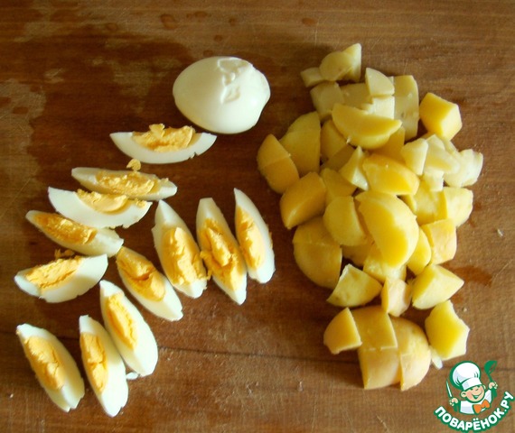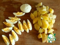 Варим картофель в мундире и яйца до готовности. Картофель режем крупными кубиками. Яйца - дольками. Картофель перемешиваем с луком. |