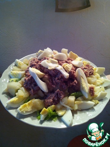 На листья салата выкладываем лук с картофелем. Поверх этого слоя раскладываем тунец. Не забываем украсить ломтиками яйца и зеленью. Немного солим и приправляем свежемолотым перцем.