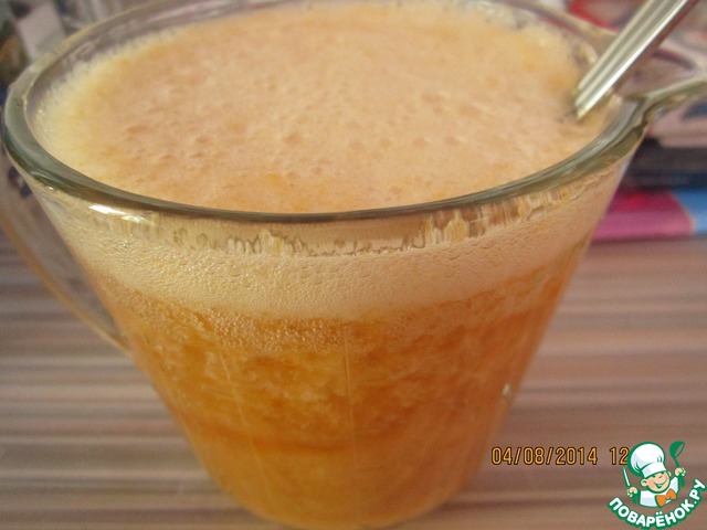 • Заливаем в графин абрикосово-сиропную смесь, вливаем сильно газированную питьевую воду
