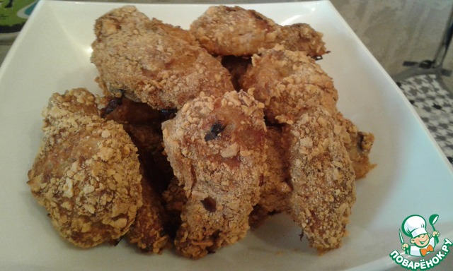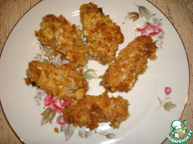 После яйцА обваливаем хорошенько крылышко в сухарях-чипсах. Видите, как красиво и равномерно крылышко покрыто?