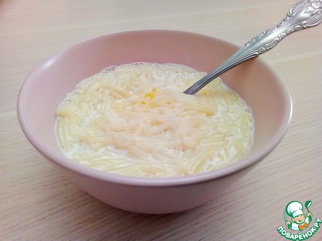Кастрюлю поставить на большой огонь, варить помешивая. Когда молоко закипит, сделать маленький огонёк. Варим помешивая ещё 5 минут, после пробуем вермишель на готовность. Если вермишель готова, снимаем с огня. Если вермишель не готова, варим до готовности.
