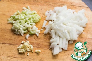 Когда он станет прозрачным, добавляем чеснок и сельдерей. Обжариваем до легкой румяности лука.