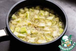 Добавляем картофель и кабачок, нарезанные на кубики. Обжариваем все вместе 2 минуты.