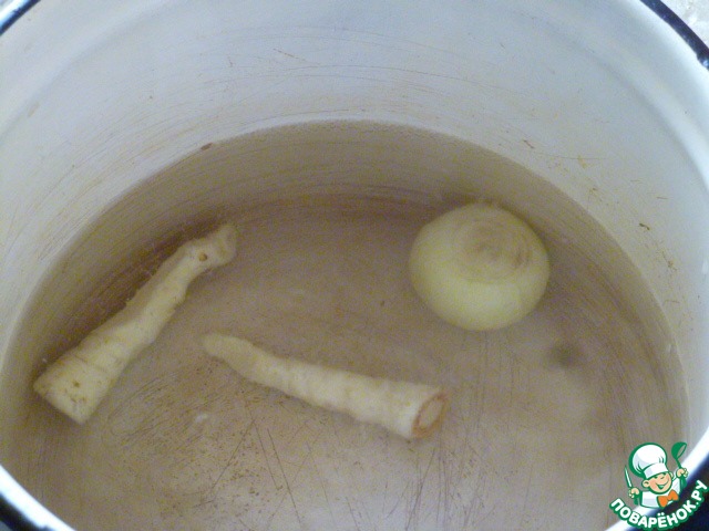 Теперь вариант второй. Когда у меня проблемы с желудком, то я не обжариваю мясо. А варю его вместе с кореньями и луком. Но тогда бульон нужно подсолить.