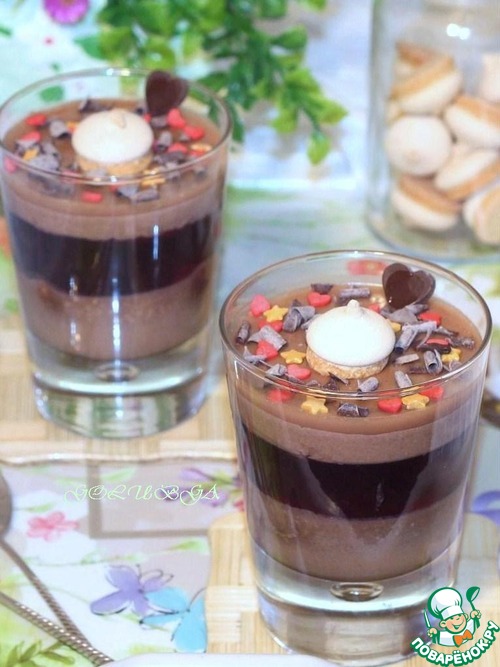 Берем 2 стакана, желательно большие и высокие. Разливаем в стаканы равномерно 1/2 часть шоколадной смеси, добавляем кусочки печенья. У меня маленькие печенюшки, и я все таки разделила их на 2 части, только не крошите! Сколько вы положите печенья зависит от высоты вашего стакана и от вкуса. У меня по 4 шт. в каждом стакане. Ставим стаканчики в холодильник до полного застывания, ~ 30 мин.