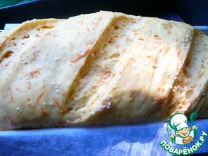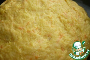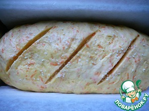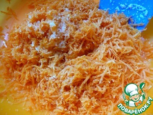 А так как у меня, пока еще нет хлебопечки, я пеку этот хлебушек следующим образом. Дрожжи всыпаю в теплую жидкость, добавляю ложку муки. Даю постоять. Тру морковь на мелкую терку, не до пюре, конечно. Всыпаю соль, сахар (если морковь сладкая, сахар можно опустить), добавляю размягченное масло и хорошенько все размешиваю. -