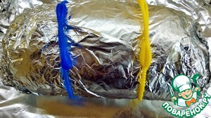 Заворачиваем мясо в пергаментную бумагу и фольгу. Помещаем в заранее разогретую духовку до 230 гр. На 20 минут, не более.