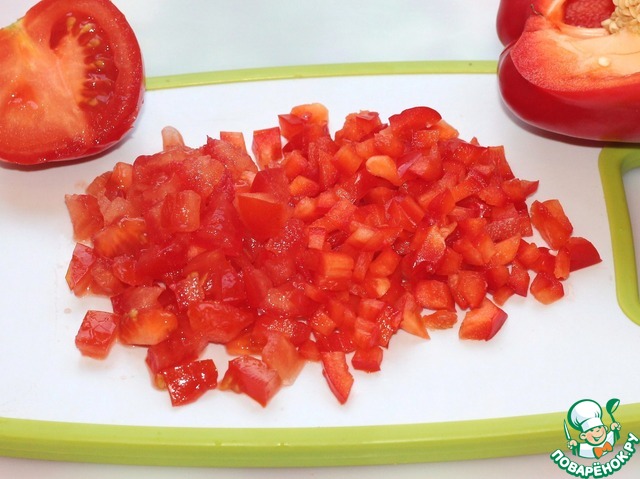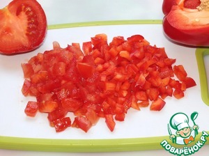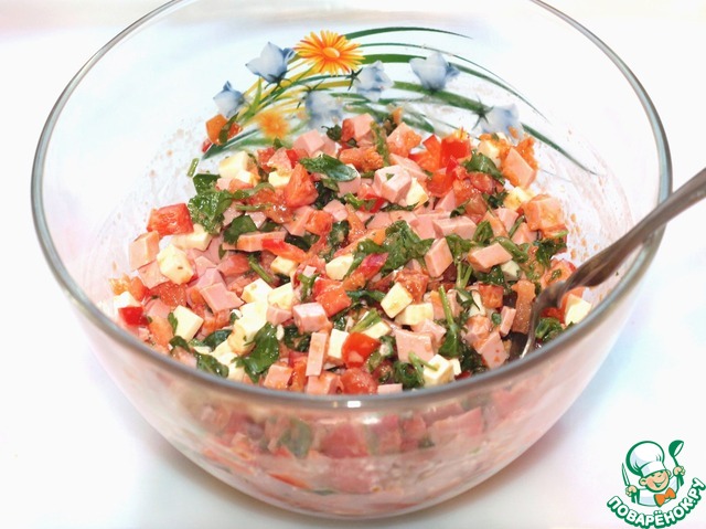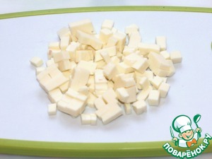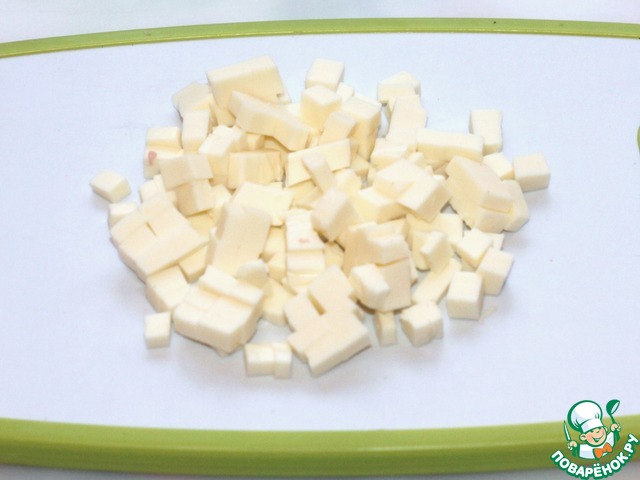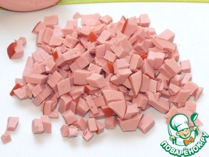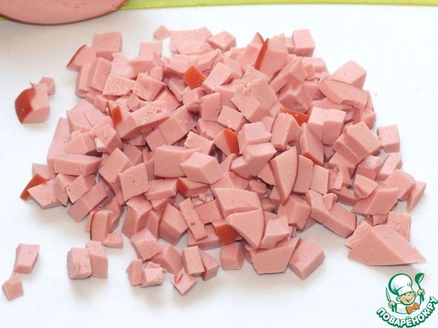 Готовим начинку: нарезаем небольшими кубиками колбасу,