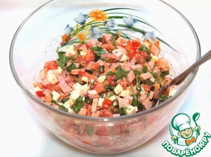 Взбиваем яйцо и добавляем к нарезанным продуктам, перемешиваем.