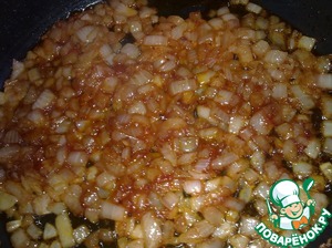 Готовим соус к закуске. Для этого очищенный лук мелко нарезать и пассеровать на растительном масле, затем добавить томатный сок, соевый соус и сок лимона. Тушить 5 минут, солим и перчим по вкусу.