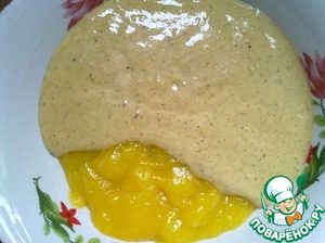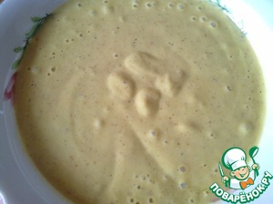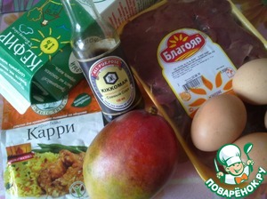 Пока маринуется печень приготовить кляр. Для этого смешать яйца, муку, карри, соль и перец ( по вкусу ). Должна получится однообразная смесь без комочков. Для экзотичности в кляр добавляется свежевыжатый сок манго с мякотью.