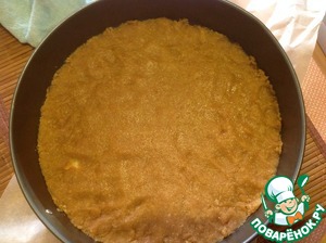 Растопить масло в микроволновке и смешать с печеньем. В форму для торта выложить печенье и разровнять ровным слоем, плотно прижимая по всей площади. Убрать в холодильник пока готовиться заливка.