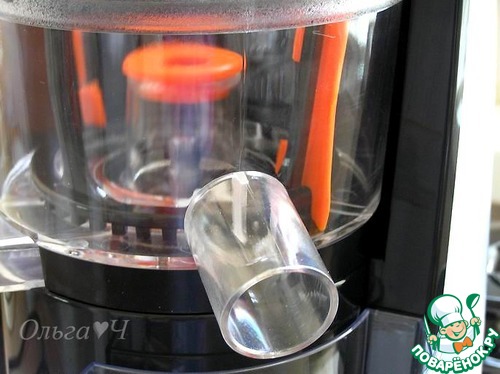 А я продолжаю свой рассказ. Итак, с помощью специальной решетки с силиконовыми вставками (о ней я говорила в этом рецепте https://www.povarenok.ru/recipes/show/92867/), сок собирается со стенок прозрачного корпуса и попадает в горловину.