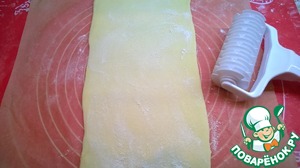 На листе пергамента, слегка посыпанном мукой, раскатать вторую половину теста, как на фото. При помощи специального валика сделать надрезы.