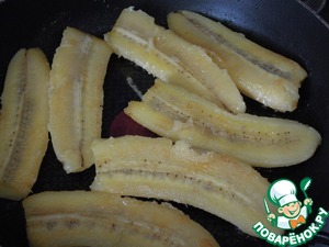 На этой же сковороде растопить масло и обжарить бананы по минуте-полторы на каждой стороне. Бананы перед этим нужно разрезать вдоль и пополам -получается 4 пластинки с каждого плода.