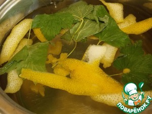 • С лимона снять цедру, а сам лимон убираем в холодильник. Он нам потребуется только на следующий день. В кастрюлю налить воду, положить листья черной смородины и цедру. Довести до кипения и вот тут самый ответственный момент. Потому что именно сейчас, от Ваших действий зависит вкус. Если Вы хотите, чтобы был сильно выраженный вкус цедры то проварите 2 мин. Если же Вам он не нравится, то просто доведите до кипения и сразу снимайте. Ну или вообще цедру не кладите.