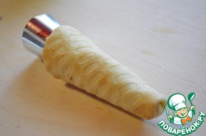 • 8. Выпекаем вафли до золотистого цвета, как достаем их из вафельницы, сразу накручиваем на конус. Обязательно подворачиваем низ, чтоб получился закрытый конвертик. Немного просушиваем вафли, наполняем их охлажденным кремом и сразу подаем к столу. Так как у меня нет кондитерского шприца я воспользовалась обычным полиэтиленовым пакетом (выложила в пакет крем, распределила в один угол, угол надрезала ножницами).