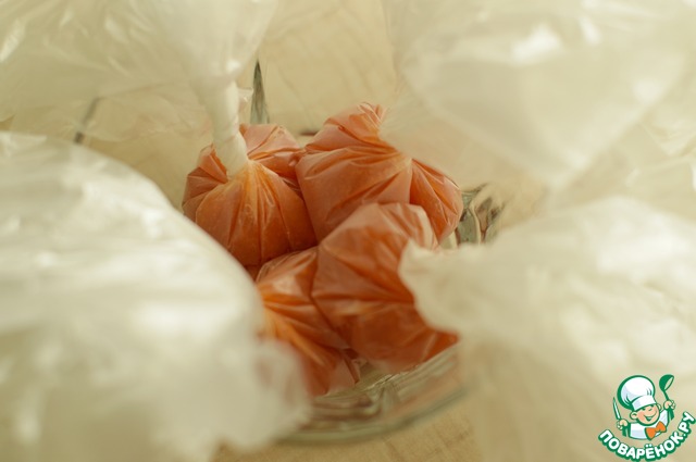 3. Теперь с помощью пакета придать смеси форму помидорки, сложить заготовки в пиалу и убрать в холодильник.