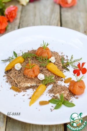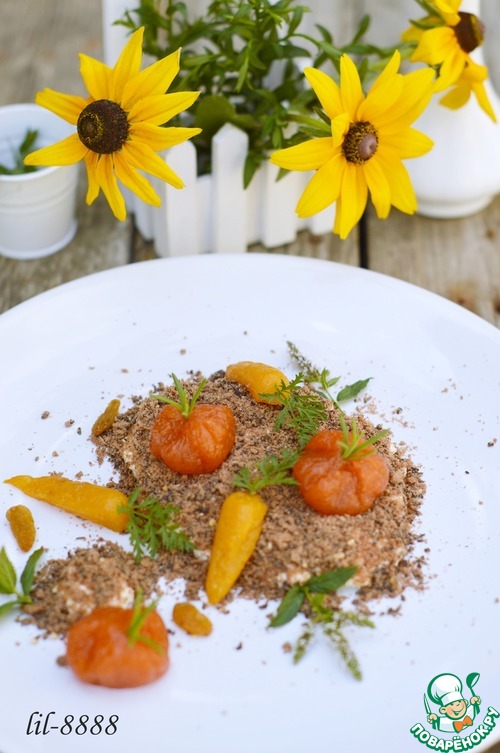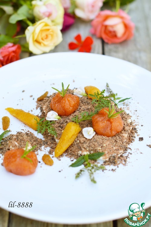 9. Затем аккуратно достать из пленки помидоры, выложить их на десерт, вставив вместо хвостиков веточки розмарина. Из форм достать морковку, уложить на десерт. Ну а дальше украсить по желанию.