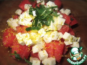 Продукты :Арбуз - 500г, брынза фетаки - 150г, лимон 1шт - 2стл лимонного сока и цедра, базилик или мята - 2-3 листочка, масло оливковое, кунжутное или кедровое - 30мл, семечки или орешки- 30г, перец красный жгучий.