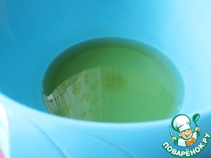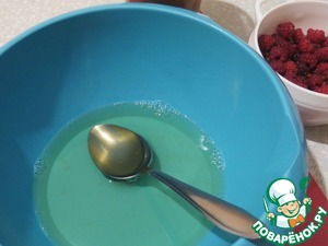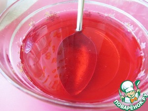 15г желатина (у меня быстрорастворимый) заливаем стаканом (200г) горячей воды и помешиваем до полного растворения.