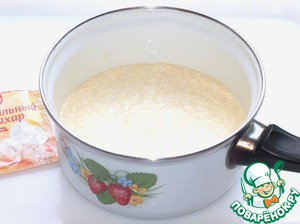 Варим крем: смешиваем крахмал, молоко, 2 ст. л. сахара, ванильный сахар и яйца. Хорошо взбиваем, добавляем 40 г масла