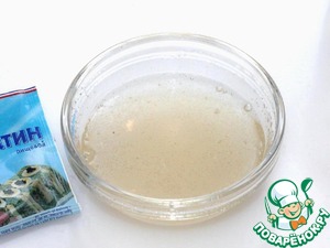 Желатин зальём водой (1:6). Затем распустим его в микроволновке или на паровой бане. Можно приготовить по инструкции.