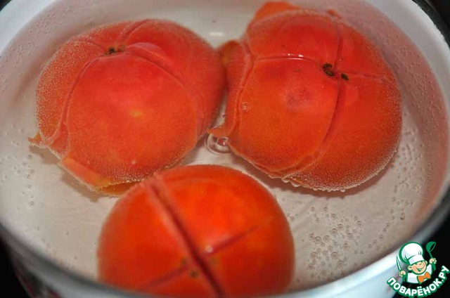 Берём помидоры, делаем крестообразные надрезы, опускаем в кипяток на 30 сек, далее в холодную воду, лучше под кран