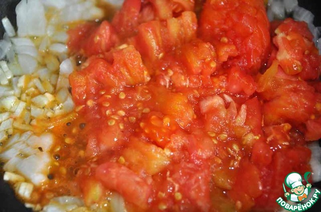 Нарезаем помидоры кубиками и кладём на сковороду, перемешиваем.